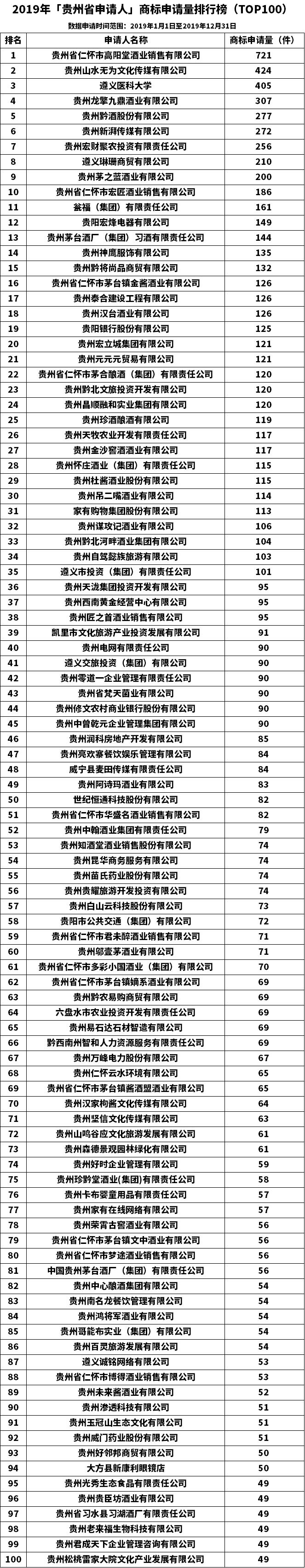 2019年「贵州省申请人」商标申请量排行榜(TOP100)