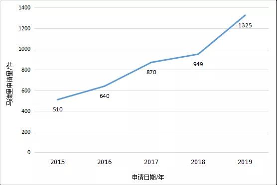 从图中可以看出,近5年来广东省马德里商标国际注册申请呈快速上升趋势,平均增长率为20.11%,增长明显,2018年广东省马德里商标国际注册申请量为949件,2019年成功突破千件大关,达到1325件。表明广东省正在加紧海外商标布局的步伐,持续快速增长。