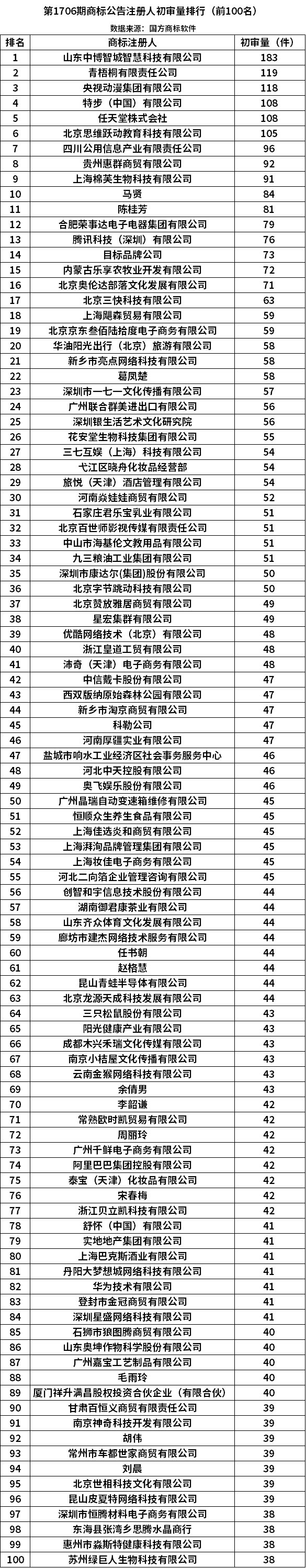 从商标注册人看,初审公告量的前3位依次为山东中博智城智慧科技有限公司(183件)、青梧桐有限责任公司(119件)、央视动漫集团有限公司(118件)。