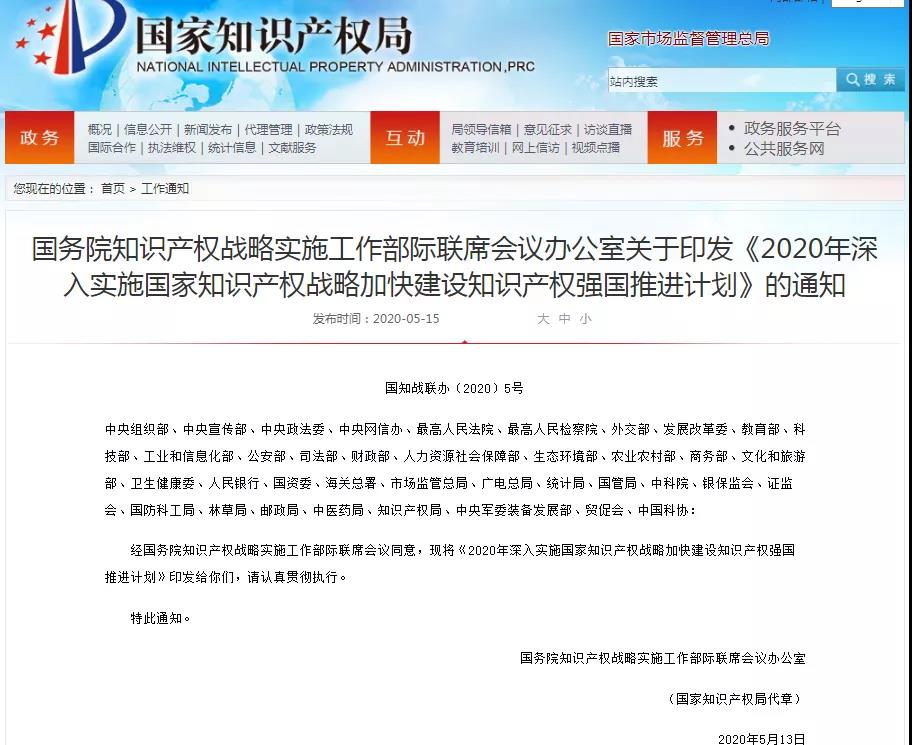 2020年深入实施国家知识产权战略加快建设知识产权强国推进计划