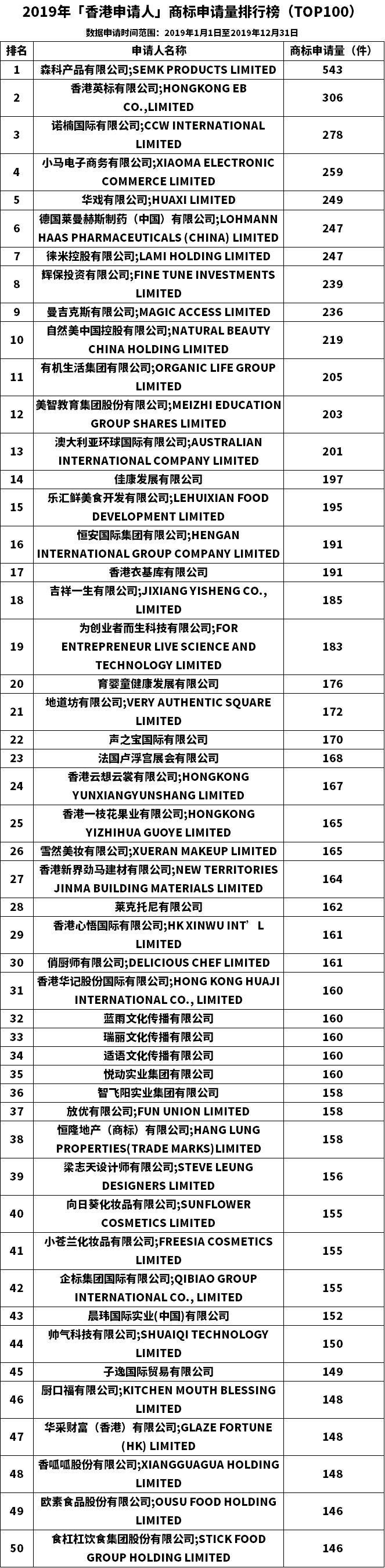 导读:近日,国方商标软件与知识产权产业媒体IPRdaily联合发布“2019年「香港申请人」商标申请量排行榜(TOP100)”,数据申请时间范围为2019年1月1日至2019年12月31日,以供读者朋友们参考交流。2019年香港商标申请量前三的企业分别为:森科产品有限公司(543件)、香港英标有限公司(306件)、诺楠国际有限公司(278件),该统计数据不包含已提交申请但未在商标局官网公布的商标数据。