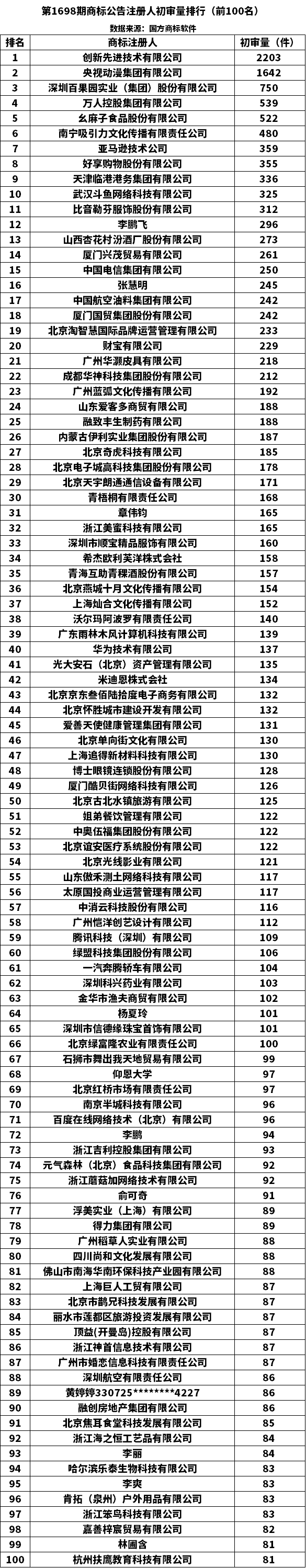 从商标注册人看,初审公告量的前3位依次为创新先进技术有限公司(2203件)、央视动漫集团有限公司(1642件)、深圳百果园实业(集团)股份有限公司(750件)。