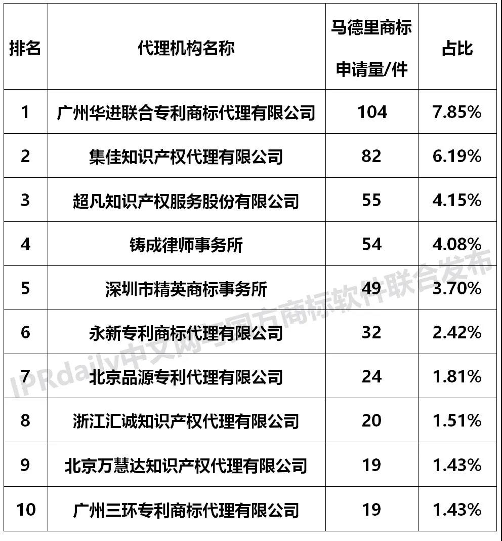 从2019年代理广东省马德里商标国际注册的代理机构看,排名前3的代理机构依次为:广州华进联合专利商标代理有限公司(104件),占比7.85%;集佳知识产权代理有限公司(82件),占比6.19%;超凡知识产权服务股份有限公司(55件),占比4.15%。排名前10的代理机构申请量占2019年广东省马德里商标国际注册总申请量的34.57%。