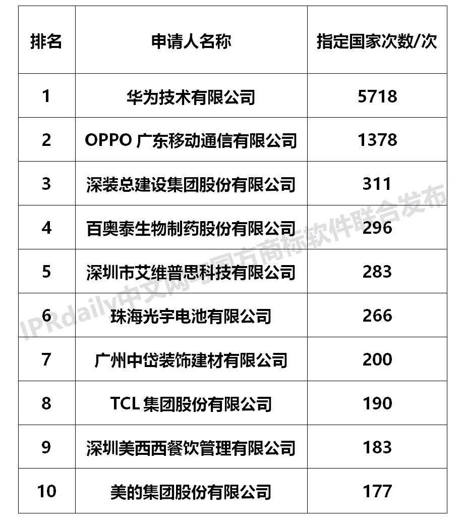 从马德里商标国际注册指定国家次数看,2019年广东省指定国家次数最多的申请人为华为技术有限公司,达到5718次,与排名第2的申请人拉开了较大的距离。第2名和第3名依次为OPPO广东移动通信有限公司(1378次)、深装总建设集团股份有限公司(311次)。