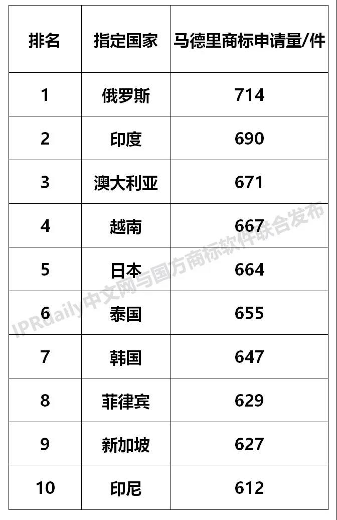从马德里商标国际注册指定国家看,2019年广东省马德里商标申请量最多的指定国家为俄罗斯,共714件。前10指定国家排名中,东南亚国家占了5位,表明2019年广东省对外经济贸易的主要市场为东南亚等国。