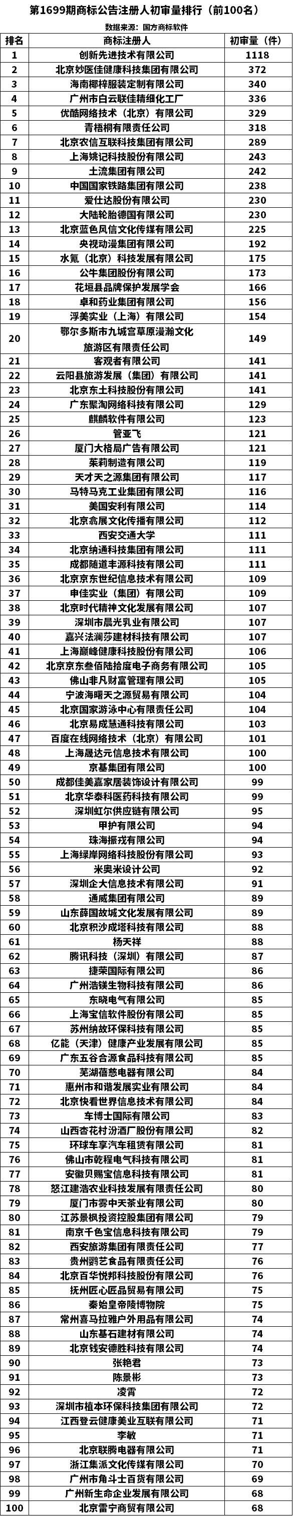 从商标注册人看,初审公告量的前3位依次为创新先进技术有限公司(1118件)、北京妙医佳健康科技集团有限公司(372件)、海南椰梓服装定制有限公司(340件)。
