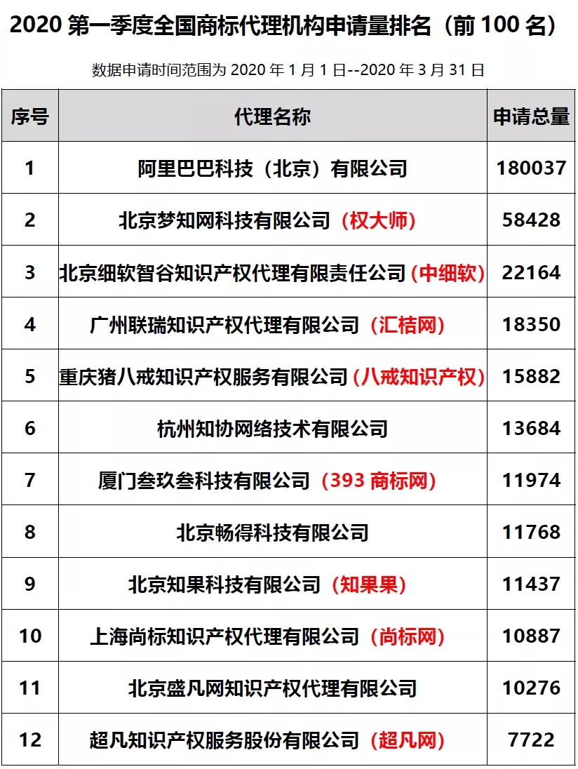2020年第一季度商标申请量前三的「全国代理机构」分别为:阿里巴巴科技(北京)有限公司(180037件)、北京梦知网科技有限公司(58428件)、北京细软智谷知识产权代理有限责任公司(22164件),该统计数据不包含已提交申请但未在商标局官网公布的商标数据。