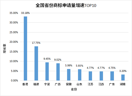 从商标申请量增速看,香港、福建、宁夏、广西、安徽五个省份占据申请量增速前5。