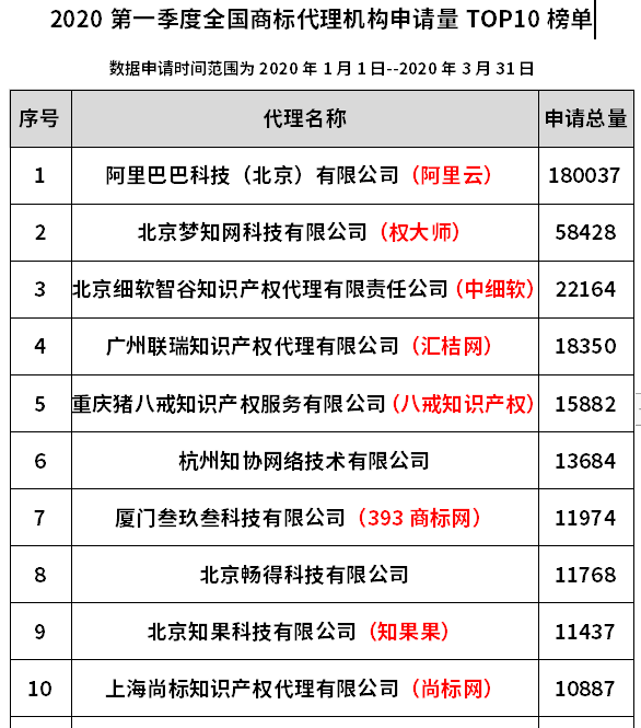 初步统计,2020年第一季度商标申请量排名全国前3的代理机构依次为:阿里巴巴科技(北京)有限公司(180037件)、北京梦知网科技有限公司(58428件)、北京细软智谷知识产权代理有限责任公司(22164件)。商标申请量与其他机构拉开较大距离的代理机构是排名第1的阿里巴巴科技(北京)有限公司,其申请量是第2名的3倍,遥遥领先其他代理机构。阿里巴巴科技(北京)有限公司在2018年10月开展商标代理业务,代理的商标申请量一路飙升,经过一年多的时间仍然保持全国代理机构榜首的位置。