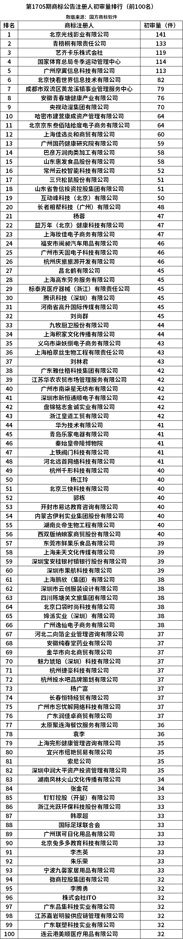 从商标注册人看,初审公告量的前3位依次为北京光线影业有限公司(141件)、青梧桐有限责任公司(133件)、艺齐卡乐株式会社(119件)。