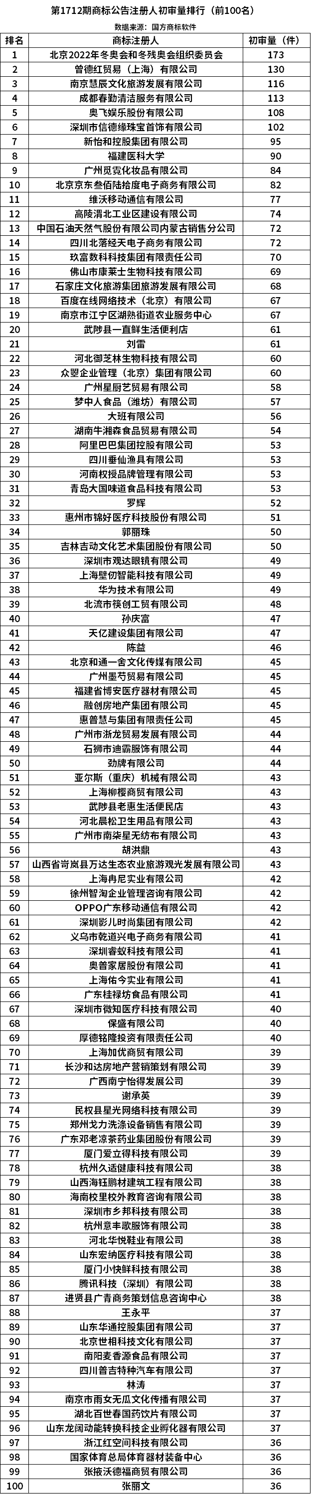从商标注册人看,初审公告量的前3位依次为北京2022年冬奥会和冬残奥会组织委员会(173件)、曾德红贸易(上海)有限公司(130件)、南京慧辰文化旅游发展有限公司(116件)。