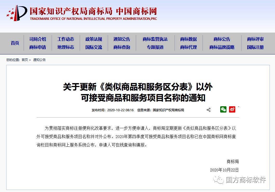 为贯彻落实商标注册便利化改革要求,进一步方便申请人,商标局定期更新《类似商品和服务区分表》以外可接受商品和服务项目名称并对外公布。2020年第四季度可接受商品和服务项目名称已在中国商标网商标查询栏目和商标网上服务系统公布,申请人可在线查询和填报。