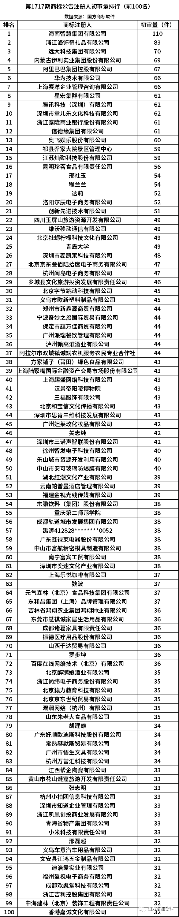 从商标注册人看,初审公告量的前3位依次为海南智慧集团有限公司(110件)、浦江洛饰奇礼品有限公司(83件)、远大科技集团有限公司(70件)。