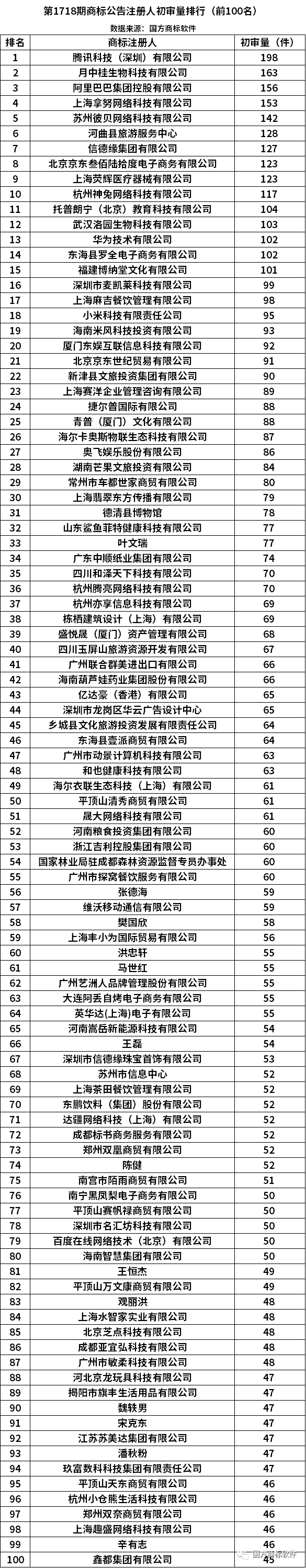 从商标注册人看,初审公告量的前3位依次为腾讯科技(深圳)有限公司(198件)、月中桂生物科技有限公司(163件)、阿里巴巴集团控股有限公司(156件)。