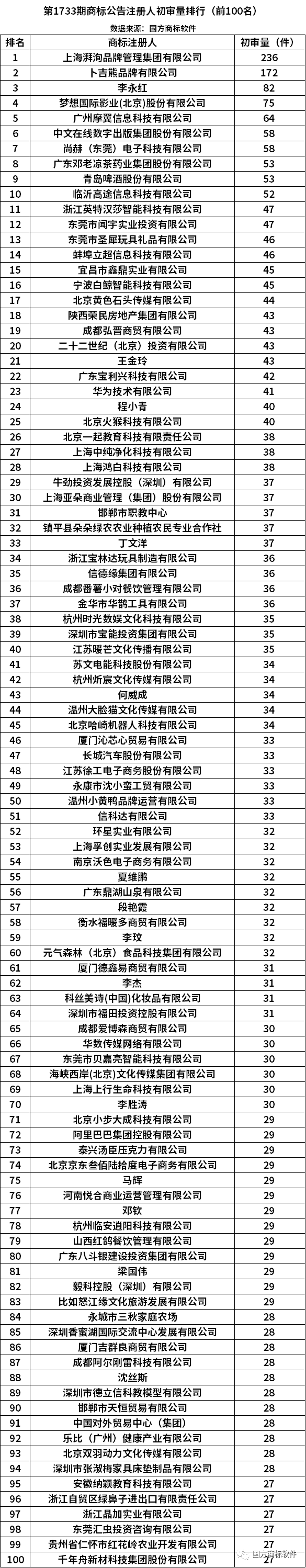 从商标注册人看,初审公告量的前3位依次为上海湃洵品牌管理集团有限公司(236件)、卜吉熊品牌有限公司(172件)、李永红(82件)。