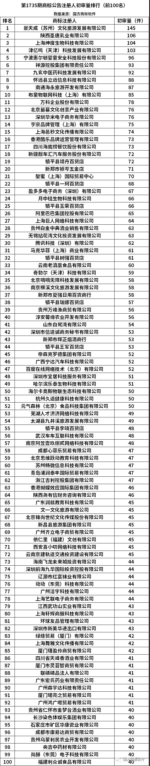 从商标注册人看,初审公告量的前3位依次为景天成(苏州)文化旅游发展有限公司(145件)、陕西圣唐乳业有限公司(106件)、上海绅度生物科技有限公司(104件)。