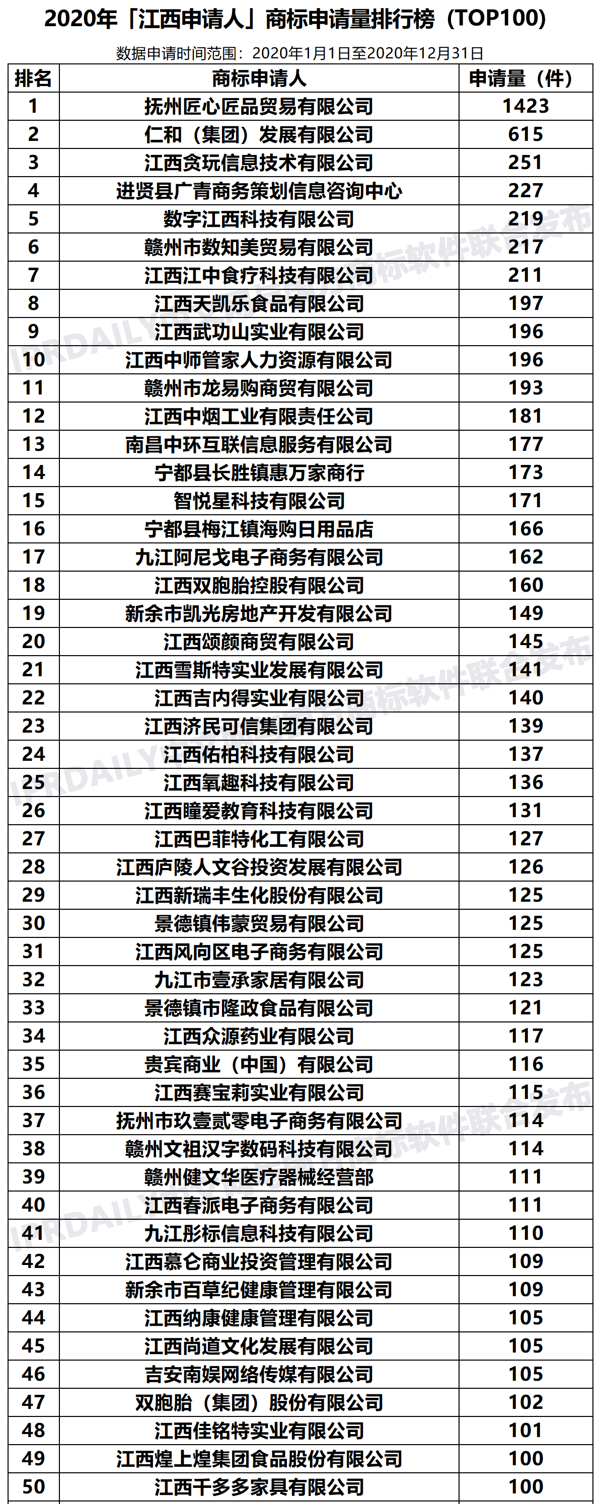 2020年「江西申请人」商标申请量排行榜(TOP100)