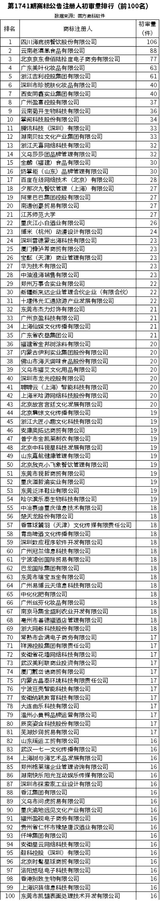 商标局于2021年4月20日发布了第1740期商标公告,初步审定公告了102218件商标。初审公告量的前5位的商标注册人依次为:四川海底捞餐饮股份有限公司(106件), 云南老滇凰食品有限公司(88)件),北京京东叁佰陆拾度电子商务有限公司(77件),广东美叶化妆品有限公司(63件),浙江吉利控股集团有限公司(61件) 。