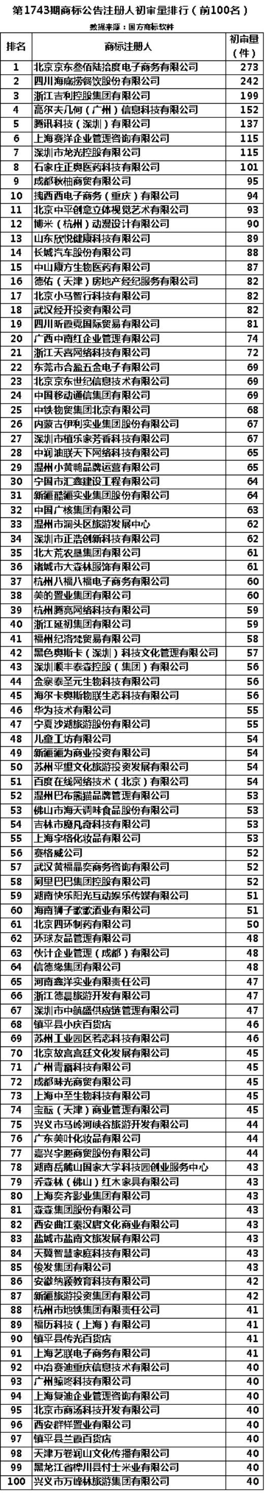 第1743期商标公告「商标注册人」初审量排行(前100名)