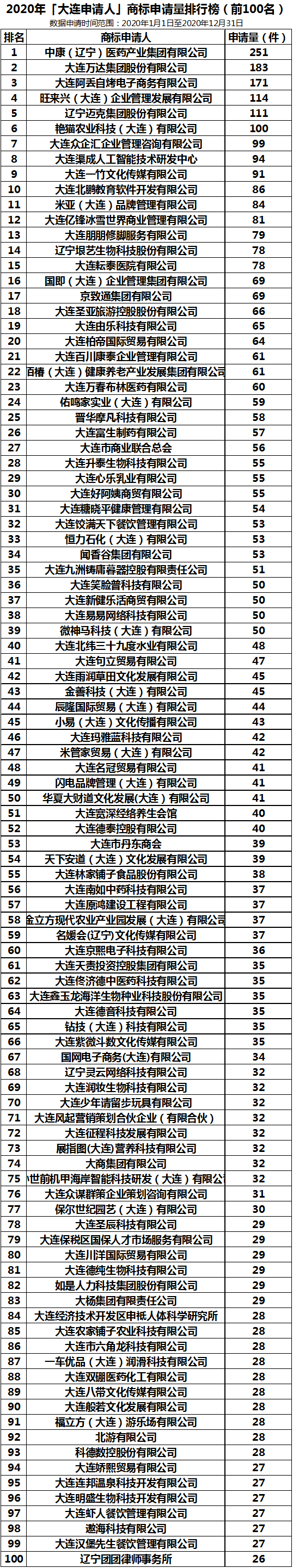 2020年「大连申请人」商标申请量排行榜(TOP100)
