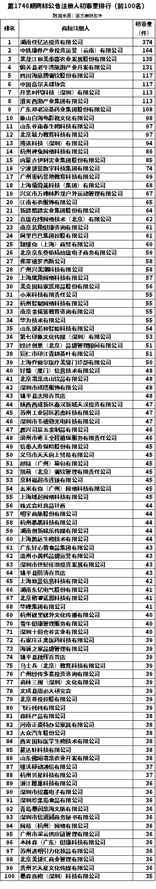 第1746期商标公告「商标注册人」初审量排行(前100名)