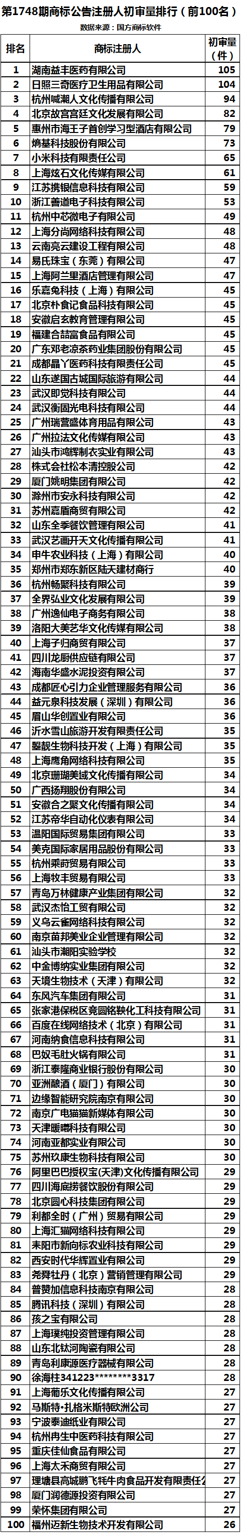 第1748期商标公告「商标注册人」初审量排行(前100名)