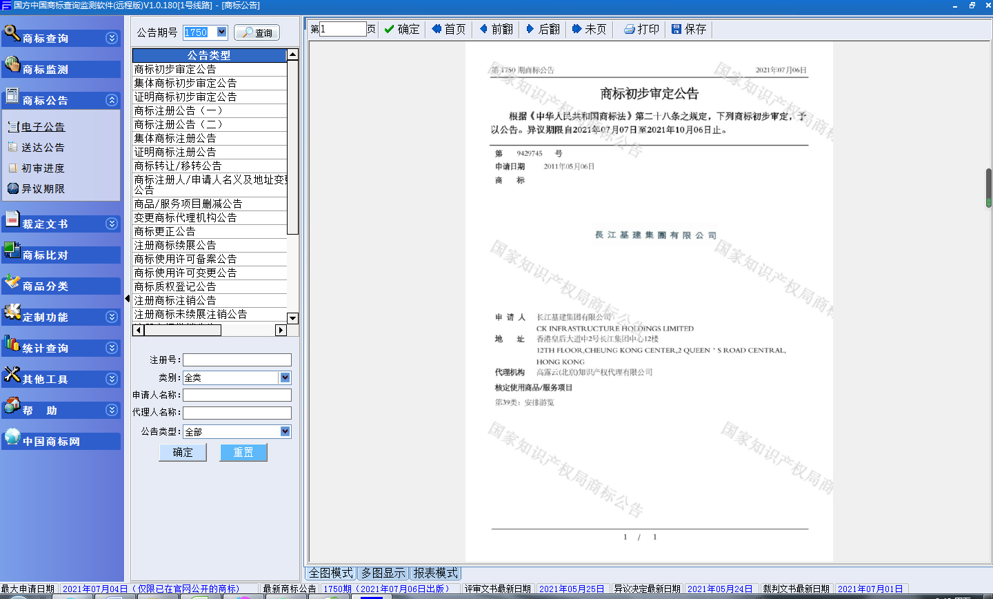 第1750期《商标公告》数据已更新,请登录软件查看监测结果!