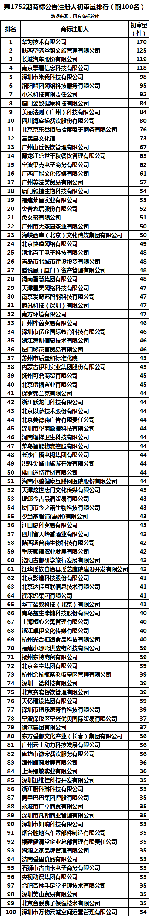 第1752期商标公告「商标注册人」初审量排行(前100名)
